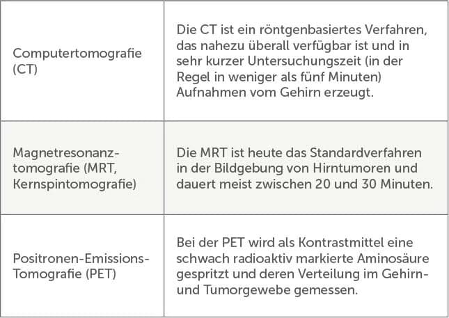 In allen Phasen der Erkrankung spielen bildgebende Untersuchungen des Hirntumors eine wesentliche Rolle. Heutzutage stehen verschiedene Verfahren zur Verfügung, um den Tumor sichtbar zu machen: